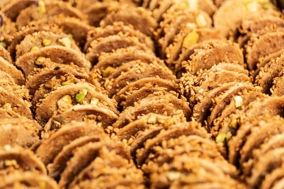 تُخبز عجينة برازق محلية الصنع بطبقة سميكة من بذور السمسم المحمصة المحشوة وتعلوها شرائح الفستق من الأسفل